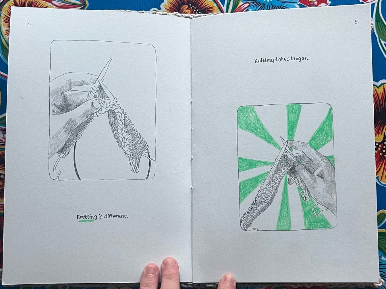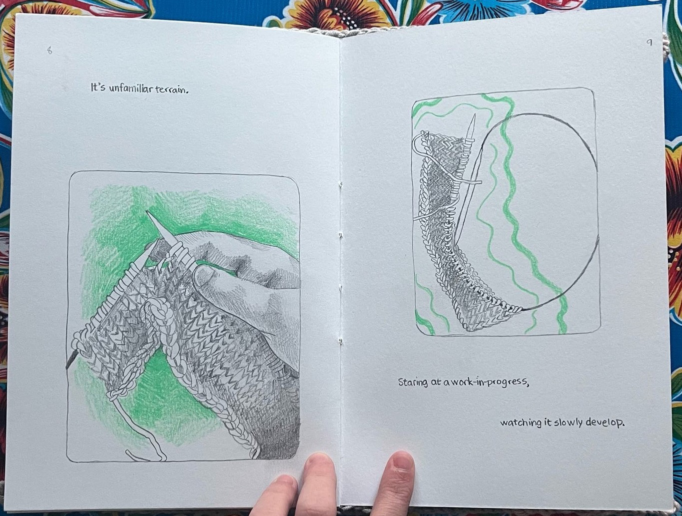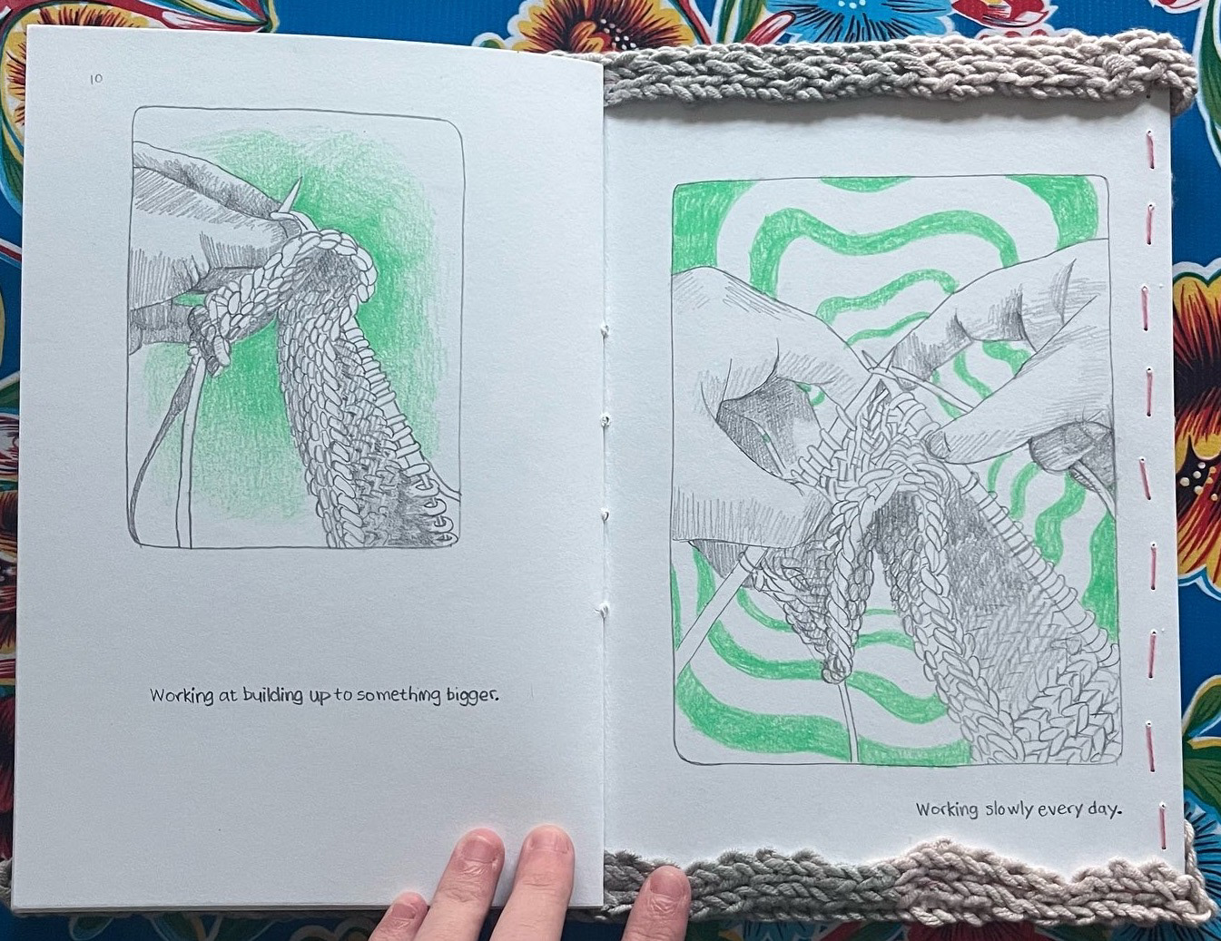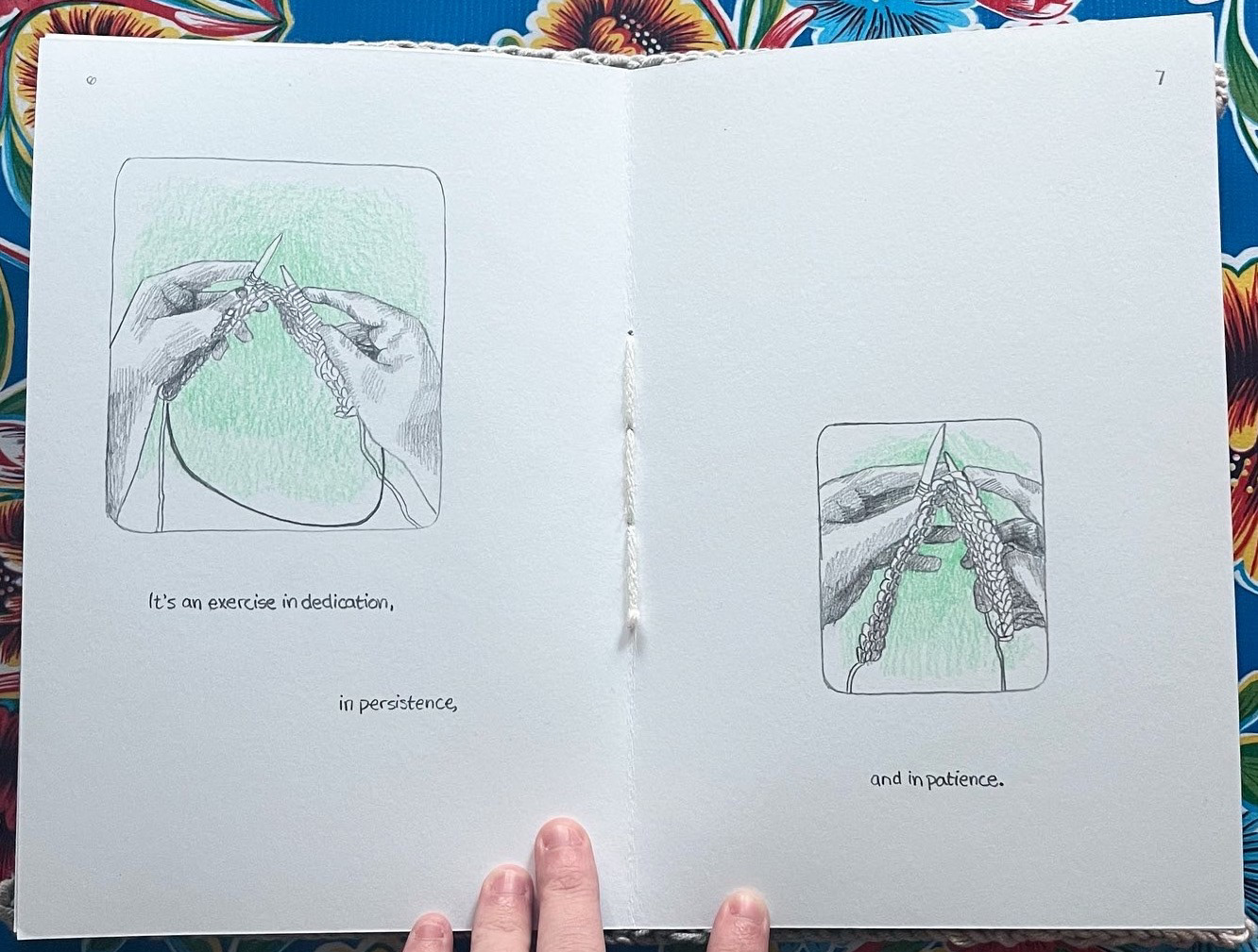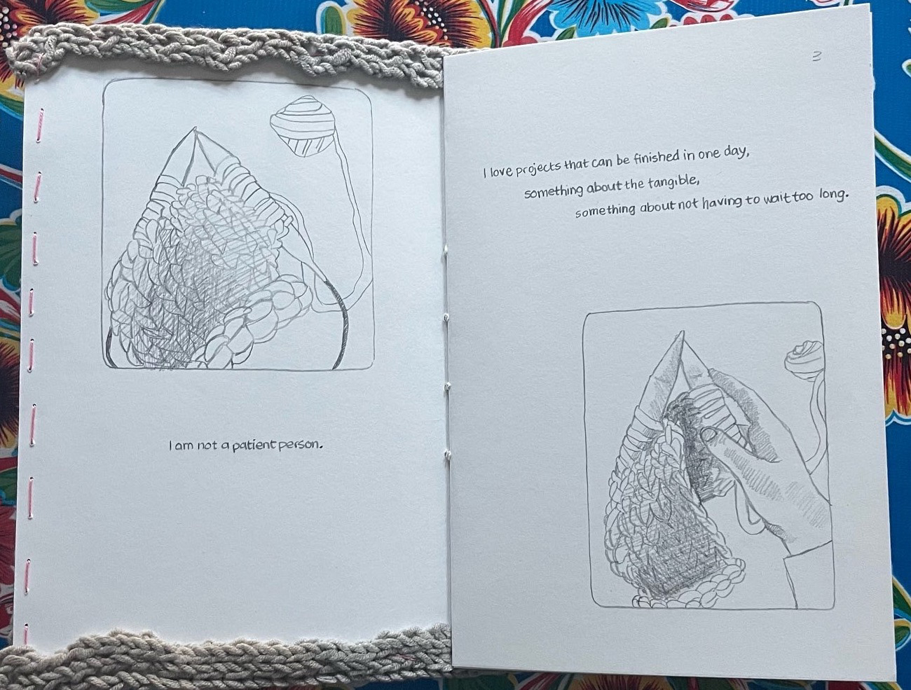 patience is practice is a one of a kind artist book featuring a hand-knitted cover and graphite drawings of the artist knitting the cover, saddle stitch bound. It is currently in the School of the Museum of Fine Arts at Tufts University Library Special Collections where it can be viewed.
